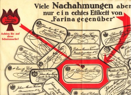 جای تعجب نیست که در پس این پستی و بلندی ها، خانواده فارینا از پیشگامان توسعه حقوق مالکیت صنعتی معرفی شوند. آقای ژان ماری فارینا-Jean Marie Farina متولد ۱۸۰۹ که در سال ۱۸۸۰ میلادی چشم از جهان فرو بست، برای ایجاد حقوق مالکیت صنعتی دهه ها جنگید. وی در نهایت در ماه نوامبر ۱۸۷۴ میلادی موفق شد تا اولین قانون مراقبت از علائم تجای را در آلمان تصویب تصویب کند و در نهایت در اول ماه می ۱۸۷۵ میلادی این قانون در کل کشور آلمان اجرایی شد. در نهایت این «یوهان ماریا فارینا» و شرکتش بود که توانست برچسب های خود را به عنوان علائم تجاری بر روی اولین ادکلن–Cologne جهان به شماره (۰۰۲۴۲۵۴۵۲) ثبت کند.